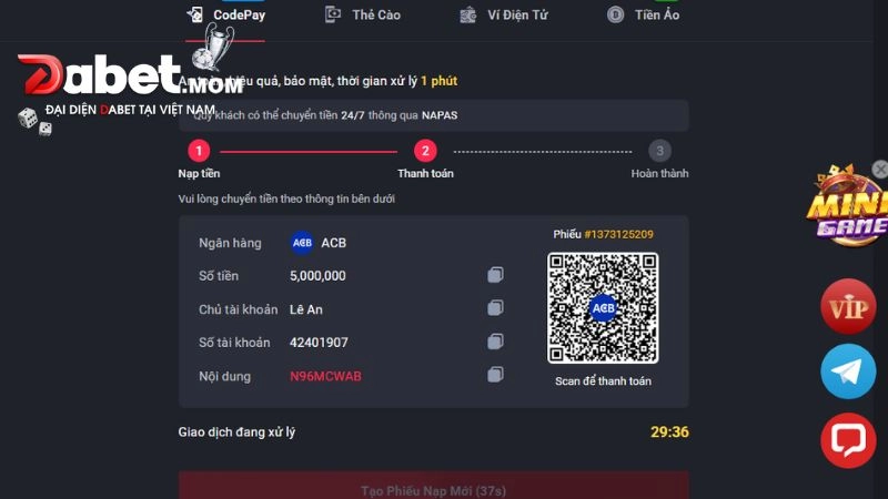 Nạp tiền dabet dễ dàng với các hình thức linh hoạt như chuyển khoản ngân hàng, ví điện tử, thẻ cào,…